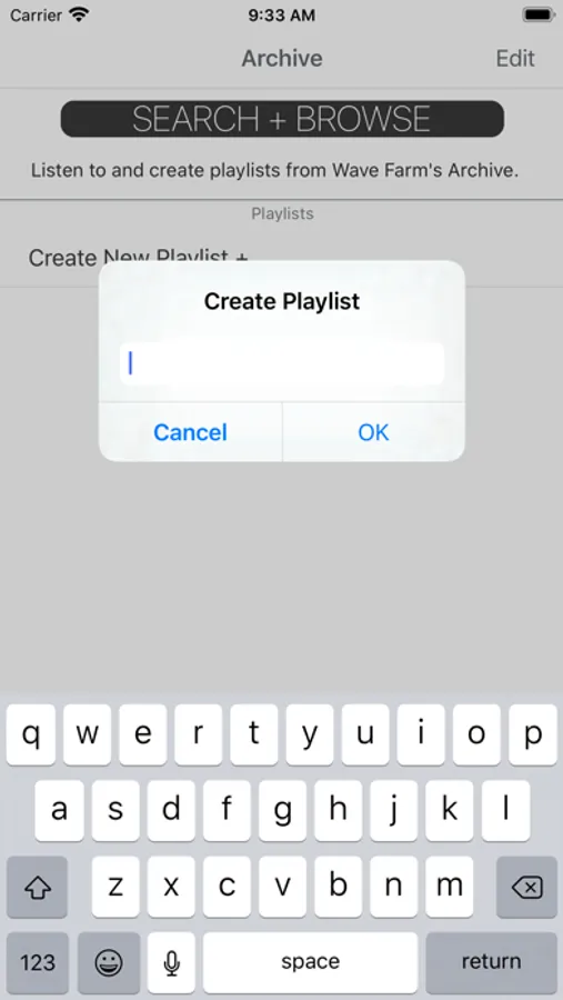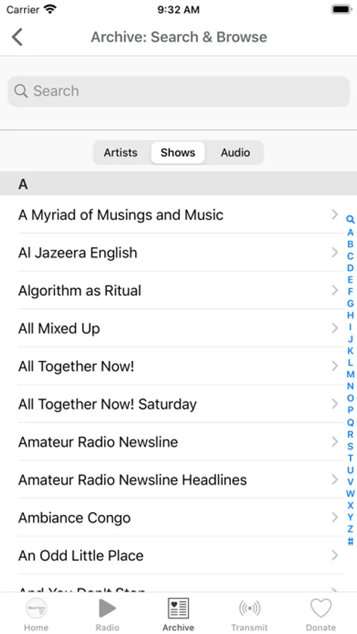 Browse artists, radio shows, and audio files. Users may create their own playlists from Wave Farm Radio's archives for customized listening. (Note that in version 1.0 listening is only possible by streaming. There is not yet a download function for offline listening.)