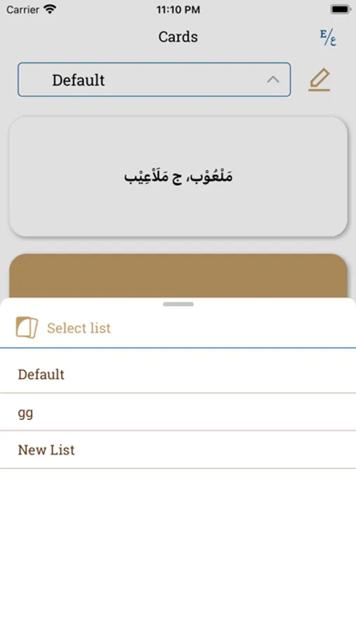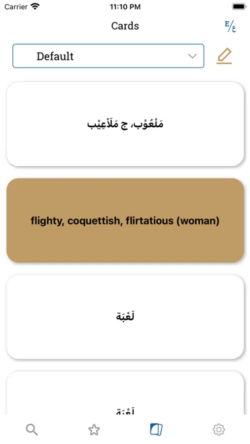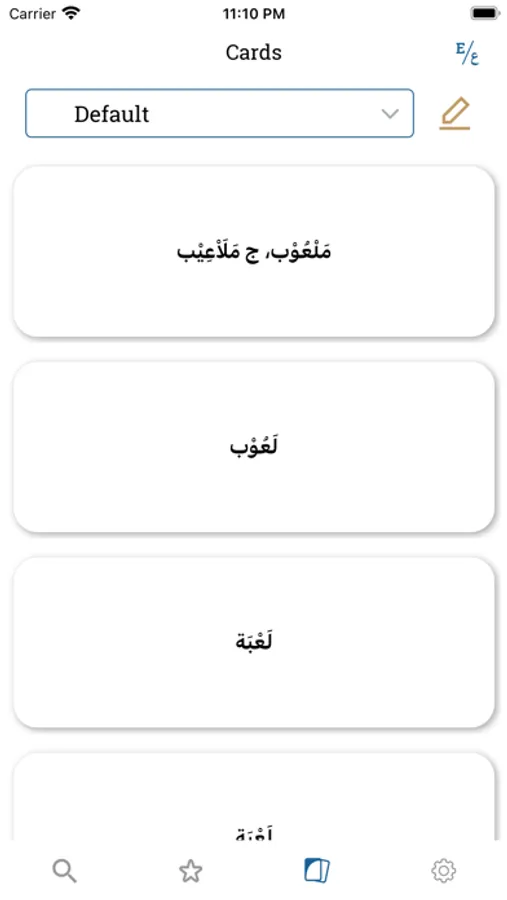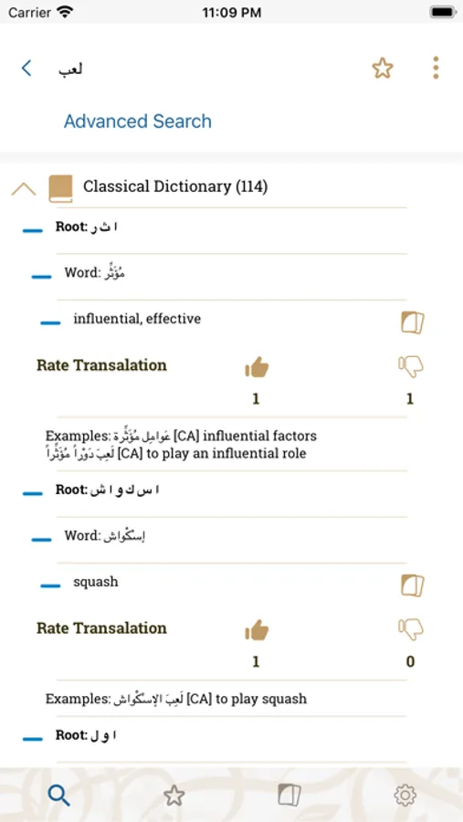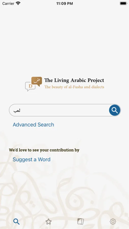 An Arabic-English dictionary for Classical Arabic (MSA) and dialects including Levantine, Egyptian, Maghrebi, Iraqi, Gulf, Yemeni, and Sudanese dialects. The dictionary features over 200,000 definitions and example phrases. Also, it allows users to search by Arabic root, Arabic word, English word, example, or phrase. Users can select multiple dialects to search in simultaneously. The dictionary also features the ability for users to save favorite searches, save words to custom flashcard lists so they can test themselves, and the ability to customize the font size in the display. The dictionary is constantly updated with new data.