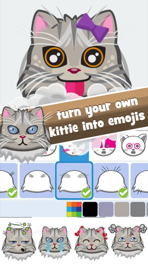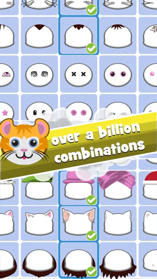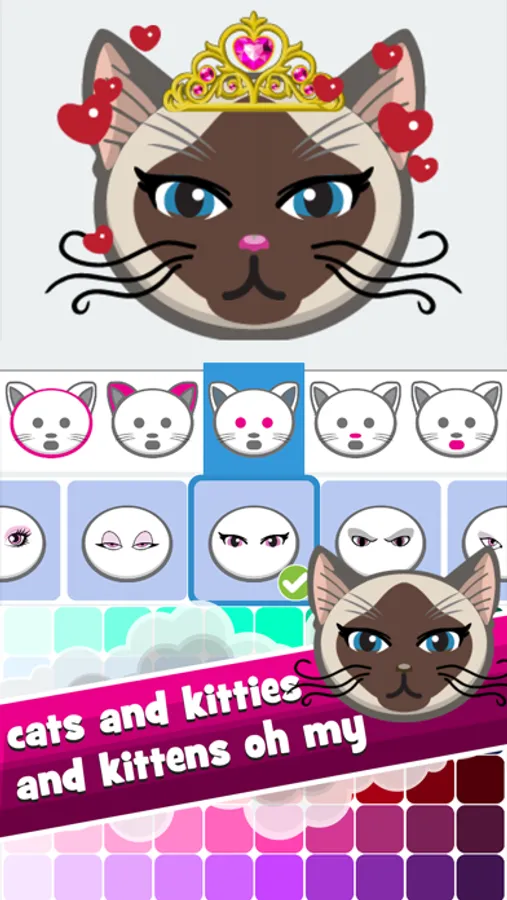 With over a Billion combinations your sure to create the perfect recreation of Snowball, Fluffy, Furball, Ser Pounce, Catsy Cline, Kitty Purry or Meowly Cyrus. You'll have fun for hours dessing up your creations and adding emotions and accessories while making awesome memories. All your (human) friends will be so jealous when you start posting your kitten creations in your text chats with them.