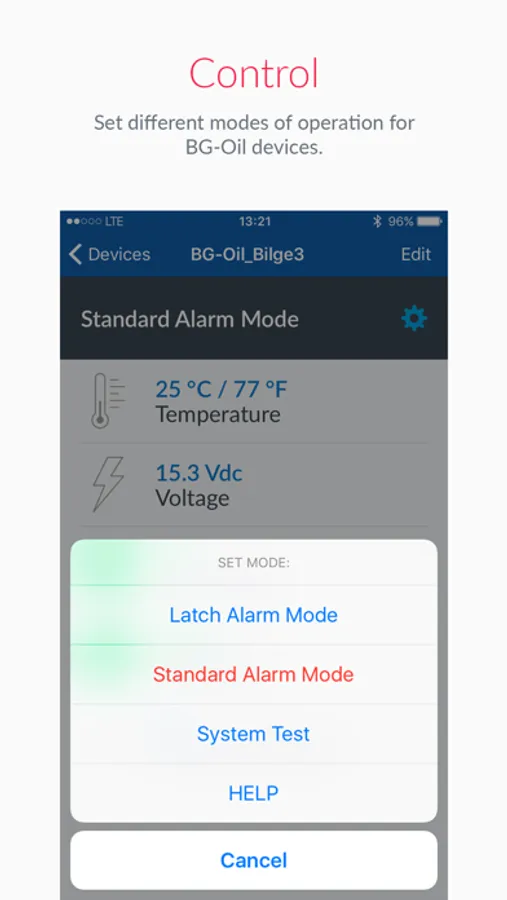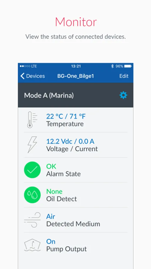 Monitor the current status of all BGI sensors. Depending on the sensor, the App allows you to monitor the temperature, voltage and current, alarm state, oil detection, detected medium, and pump output.