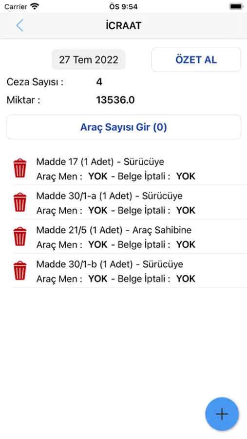 Uygulamanın anasayfasındaki EK ÖZELLİKLER kısmından İcraat modulünü açtığınızda, içinde bulunulan takvim gününe ait yaptığınız işleri girebileceğiniz pencere açılır. Sağ altta bulunan mavi + işaretine basarak yeni ceza girişi yapabilir, sol üstteki özet al butonu ile o günkü icraatinizin özetini görebilirsiniz.