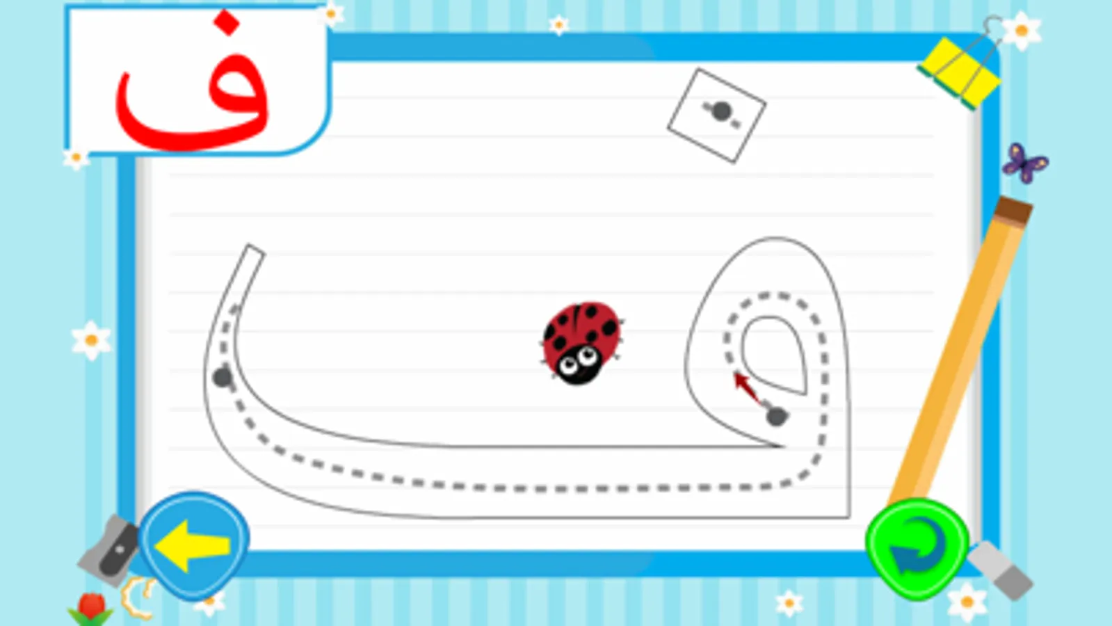 • تعليم كتابة الحروف العربية للاطفال بطريقة صحيحة حيث تقوم الدعسوقة بتوجيه الطفل للمسار الصحيح