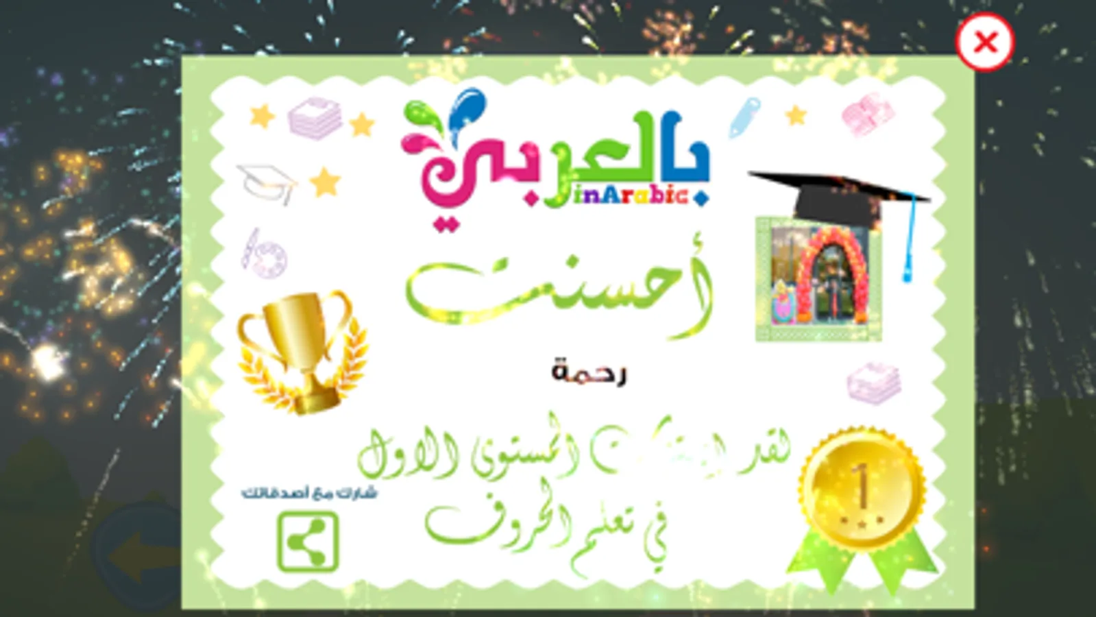 • الدبلومة: وبعد أن تعب الطفل من التعلم واللعب يتم تشجيع الطفل ومنحه شهادة تقدير بعد اختبارالحروف ويستطيع مشاركة نجاحه علي وسائل التواصل الإجتماعي أو إرسال الشهادة كصورة إلي أصدقائه