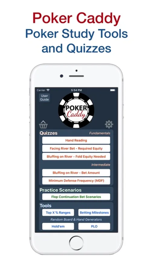 Poker Caddy is a collection of Tools, Quizzes, and Scenarios to help take your Poker game to the next level. Click the more button for a full list of features and quizzes.