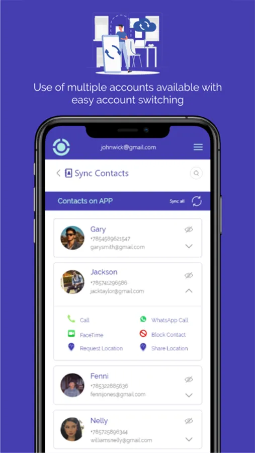 Sync is a smart address book. where you can merge contacts using drag and drop. You can open other apps on your iPhone from inside Sync to communicate with others like you normally do. You can securely send or request your location to or from anyone on the hub along with a open or locked message.