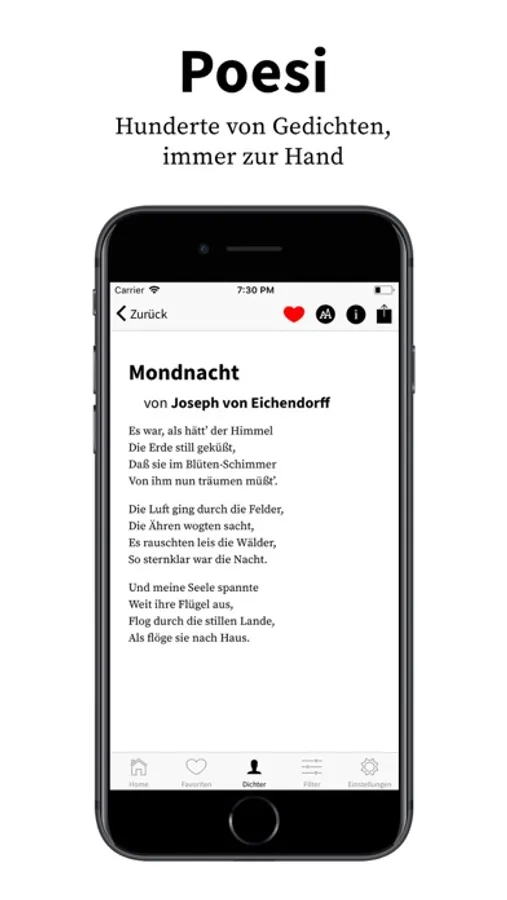 Poesi offers a collection of English and German poetry from the Middle Ages all the way to the 20th century. The app contains over 1300 German and over 1000 English poems, all carefully selected and in quotable form for scientific use. You can select a poetry language after the first app launch and expand the app via In-App purchase to read poems in the other language afterwards.