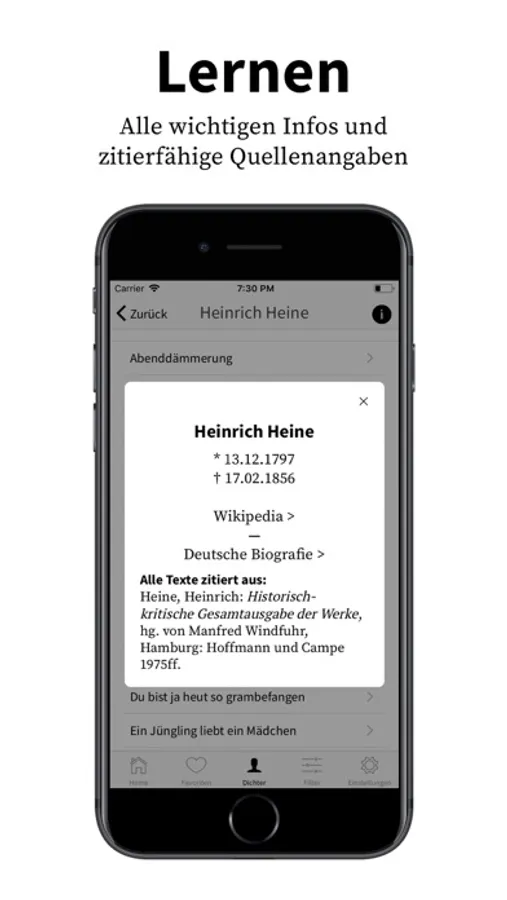 Every poem is cited following the most relevant or newest completed edition and are therefore quotable, directly out of the app. The works cited are accessible by tapping the information button above the respective poem.