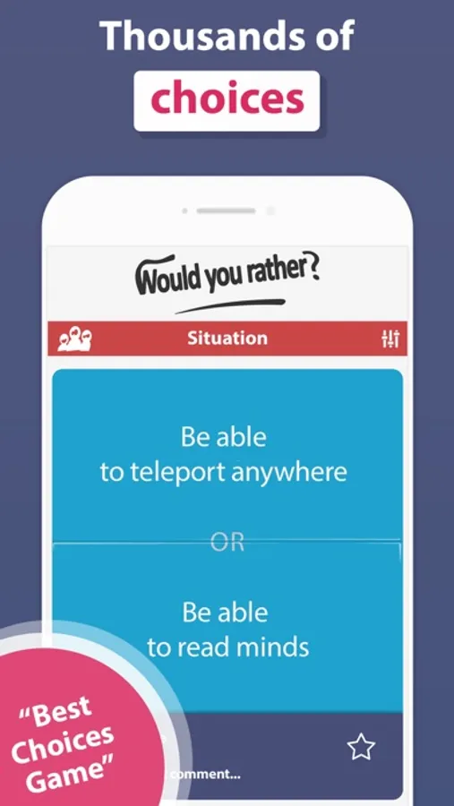"Would you rather ? Impossible Choice" is a crazy game of choice. Through this game, you will be able to dream of having superb power, having to eat insects of all kinds, living as a star, choosing among crazy situations... in short, a whole bunch of funny dilemmas to have fun times.