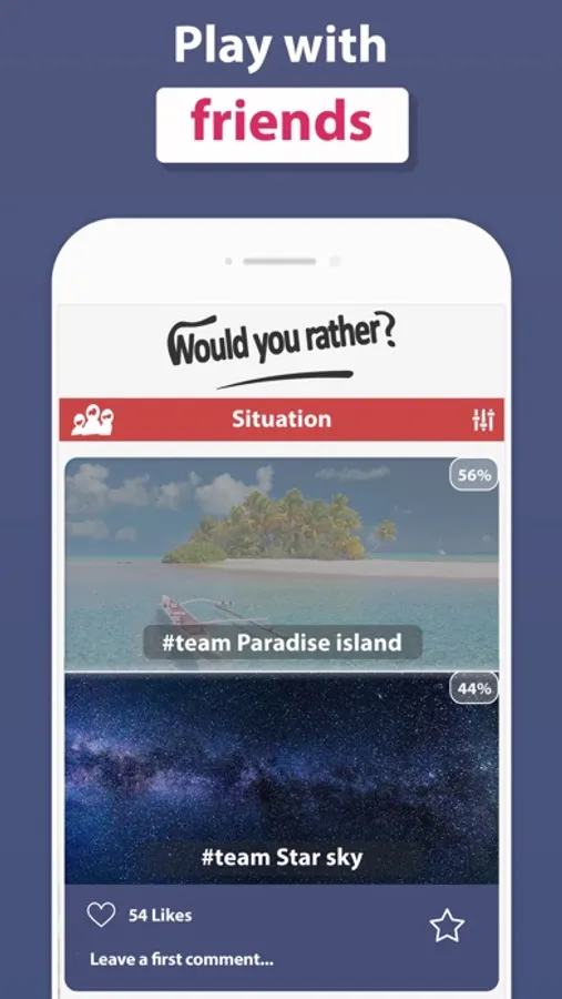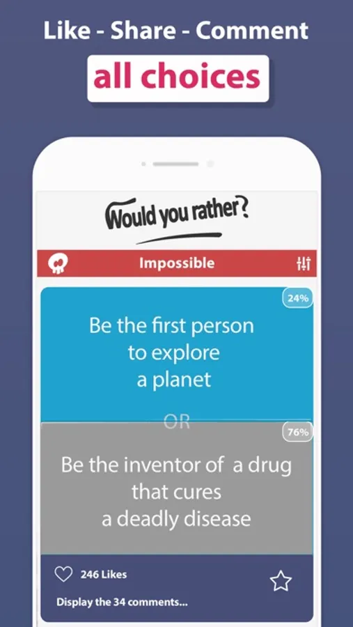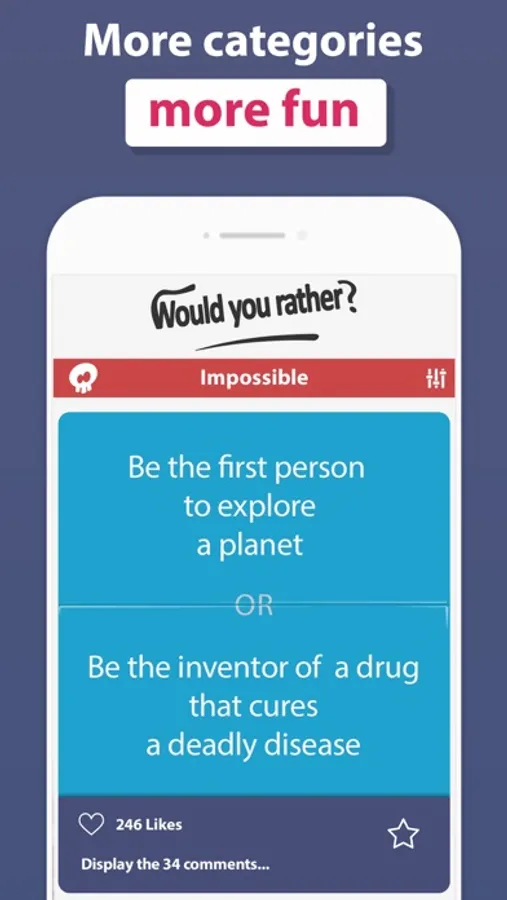 ■ With the creation of a free account, participate in the Would you rather community, by proposing and sharing your best Would you rather. This game becomes the place where everyone can participate and express their ideas of dilemmas.