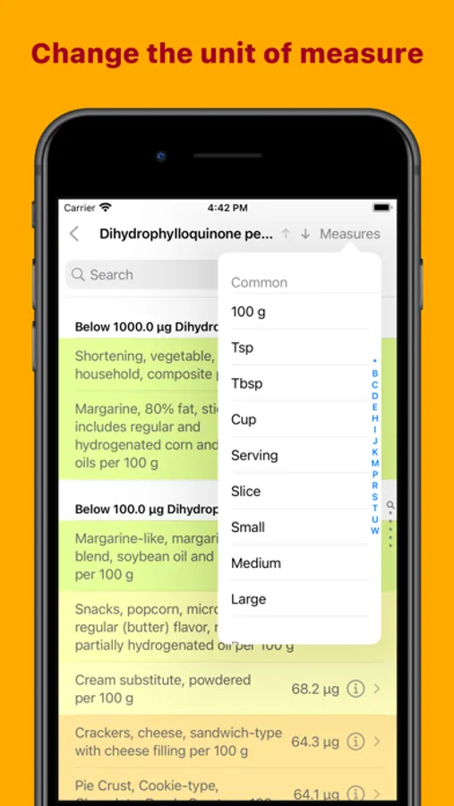 If you want to see how nutrients compare per tsp, tbsp, cup, or in other units of measure, just select from the Measures menu.