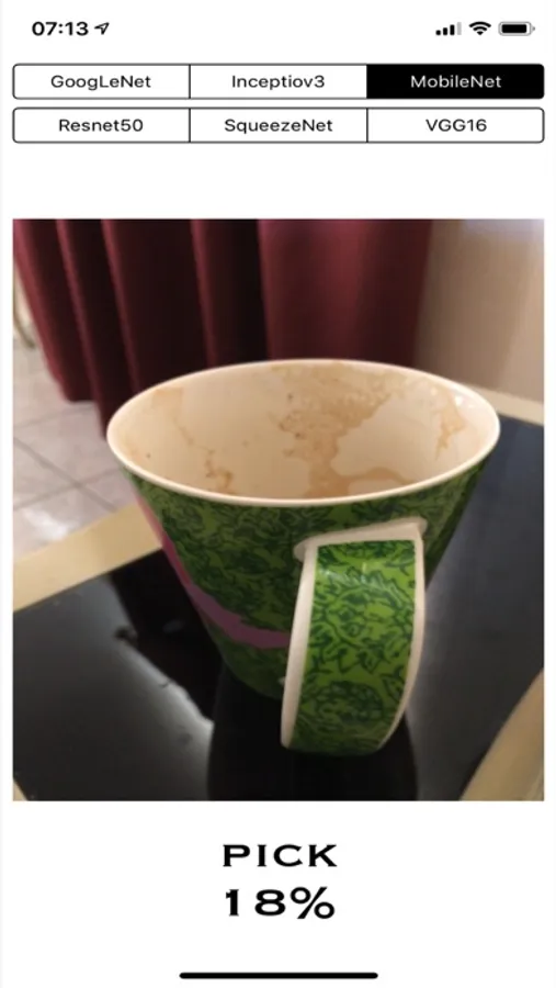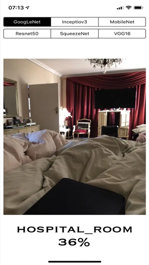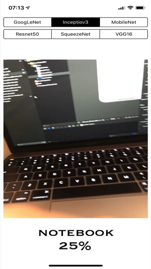 This Artificial Intelligence Camera uses Machine Learning models to classify images real time from your iPhone camera. You don't need to take a photo, you just point your iPhone camera at any object or scene, and the classification happens instantaneously. I've provided five different machine learning models available for iOS, including: GoogLeNet Places (for classifications of scenes), Inceptionv3, VGG16, Resnet50, and SqueezeNet (all trained to classify objects across 1000 categories). In addition to classifying things, it also provides the probability of the classification label given.