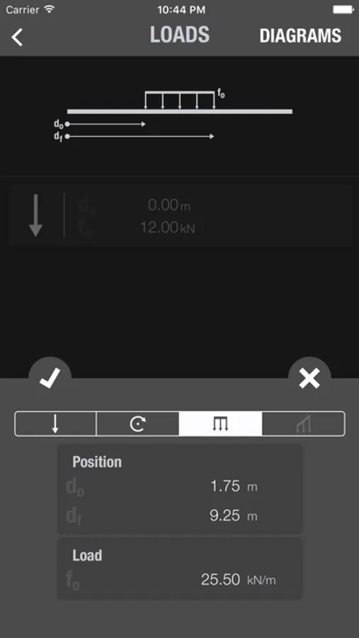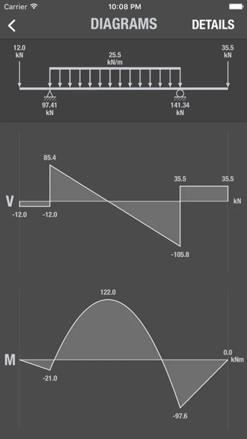 Bending moment and shear force diagram calculator, it generates the Reactions for the supports and draws the SFD (Shear Force Diagram) and BMD (Bending Moment Diagram) of a simply supported beam.