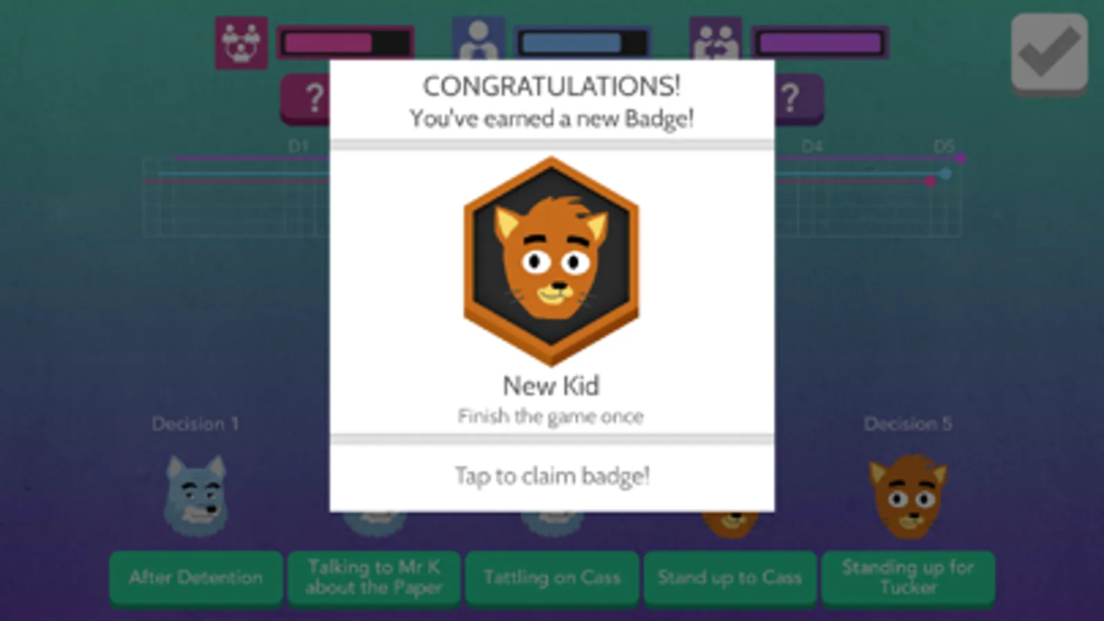 WyldWood Stories centers around dialogue-based interaction. Players participate in a character-driven story made up of a series of conversations, selecting responses at key junctures. The responses represent using (or not using) the key behaviors to varying degrees. At the end of the game, the player receives feedback about their performance, enabling repeat play toward mastery.