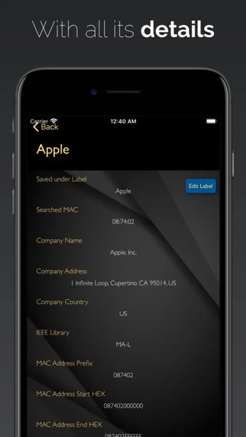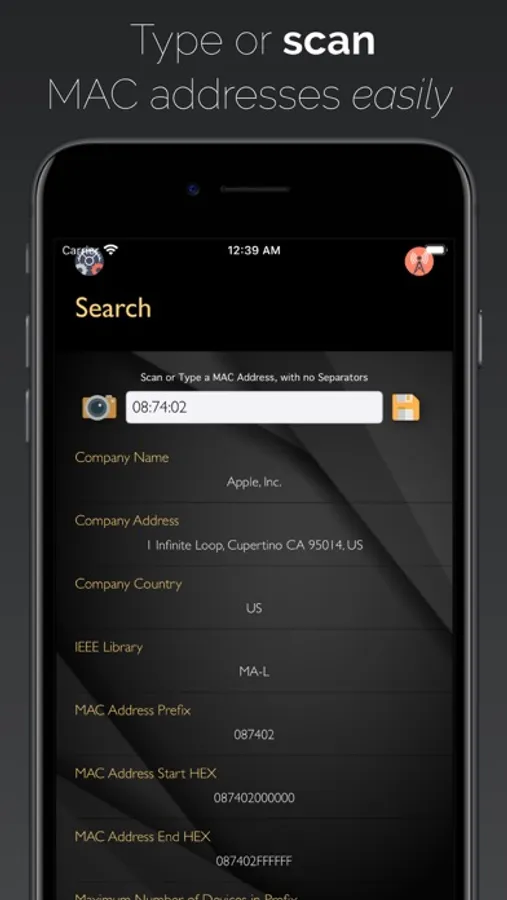 Company name, address, location on Maps, MAC address prefix, HEX start, HEX end and the maximum number of devices in a given prefix. You can simply write the MAC or scan it with the embedded scanner.