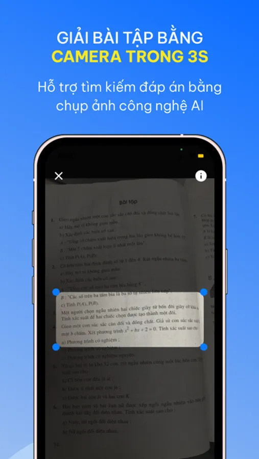 Giải bài tập bằng camera công nghệ AI kết quả lời giải chỉ trong 3 giây. Giải bài tập vô cùng đơn giản chỉ cần bật camera chụp ảnh câu hỏi sau 3 giây có ngay lời giải và 10 bài tập tương tự giúp học tốt bài tập về nhà, bài tập ôn thi. Nhận diện hình ảnh bằng công nghệ camera ai chụp hình chữ viết tay, chữ in hoa hay nhập bằng text cung cấp lời giải bài tập chi tiết, rõ ràng, chính xác phù hợp, có cả các dạng bài và đáp án tương tự để học sinh luyện tập.