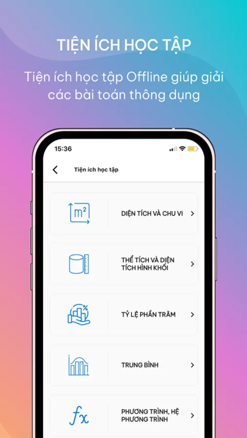 Cung cấp hơn 18 tiện ích học tập Offline giúp giải các bài toán thông dụng chương trình phổ thông như tính chu vi và diện tích các hình phẳng, tính diện tích bề mặt và thể tích các hình khối, giải phgương trình bậc nhất và bậcx hai, giải hệ phương trình bậc nhất 2 ẩn, lượng giác, logarit, đổi đơn vị, tỷ lệ phần trăm, luỹ thừa và khai căn, trung bình cộng, năng luợng và nhiên liệu, từ điển tiếng Anh, máy tính Casio