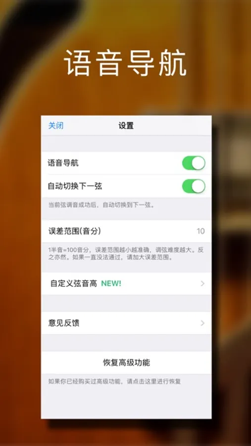 - 自定义弦音高,你可以按照自己需要调整每条弦的目标音高。