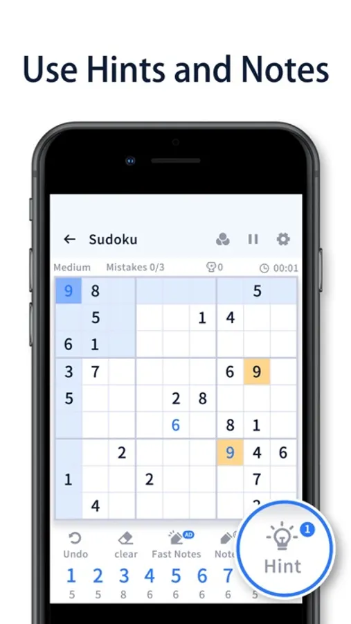 -- Hints. When you get stuck on a difficult puzzle, use the hints and the system will automatically fill in the correct number in the cell you choose to guide you through the difficulty.