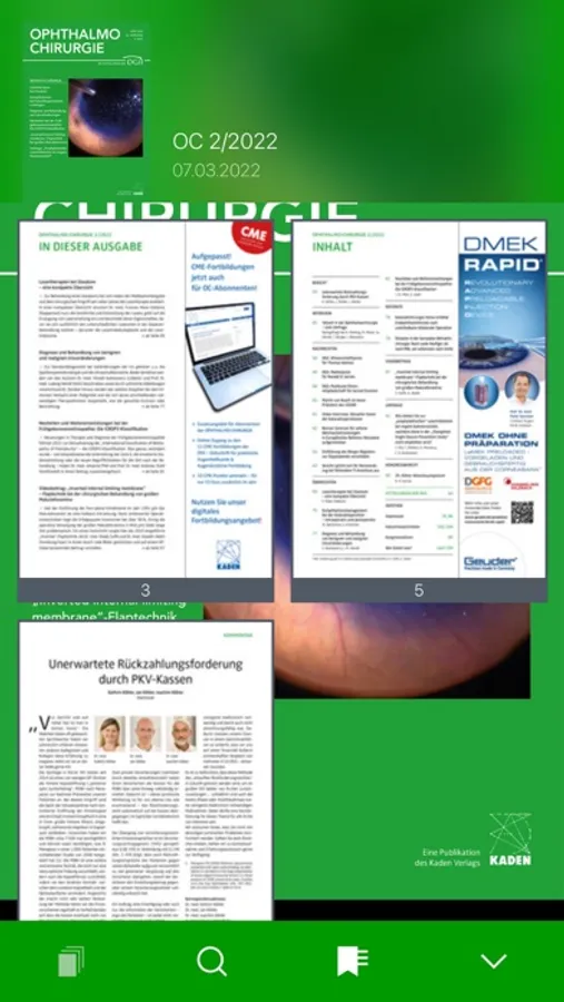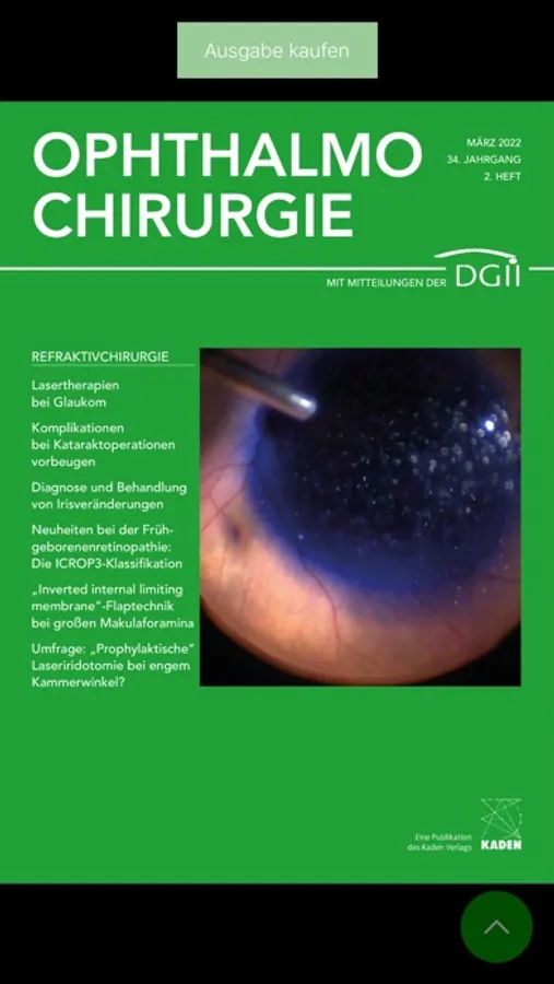 Die digitale OPHTHALMO-CHIRURGIE spricht als einzige deutschsprachige Zeitschrift gezielt und exklusiv die Belange der operierenden Augenärzte an. Zentraler Bestandteil der OPHTHALMO-CHIRURGIE sind auf die tägliche Praxis zugeschnittene, reich bebilderte Übersichtsbeiträge, Videobeiträge sowie Zeitschriftenreferate aus der internationalen Literatur. OPHTHALMO-CHIRURGIE legt die für Operateure relevanten gesundheits- und berufspolitischen Entwicklungen dar und berichtet ausführlich von Fachkongressen. OPHTHALMO-CHIRURGIE erscheint sechsmal im Jahr.