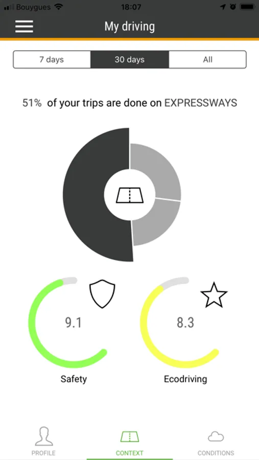 • Summary of mileage according to the road context and conditions of the rides (weather, week / weekend and day / night).