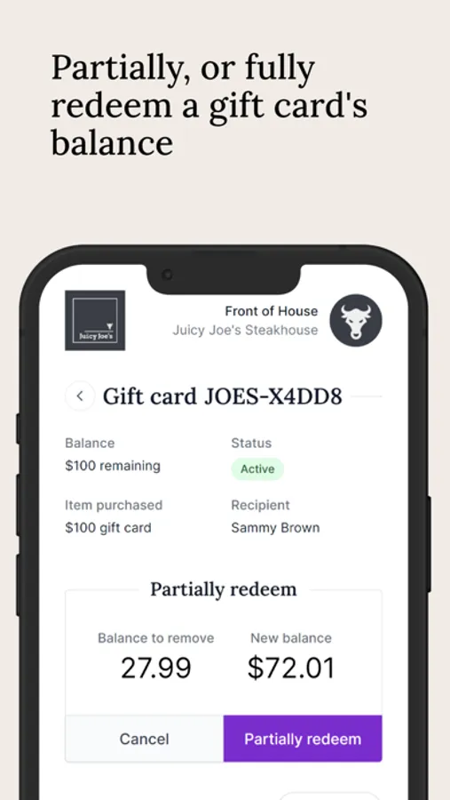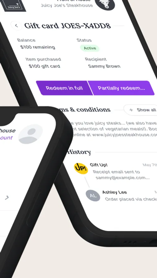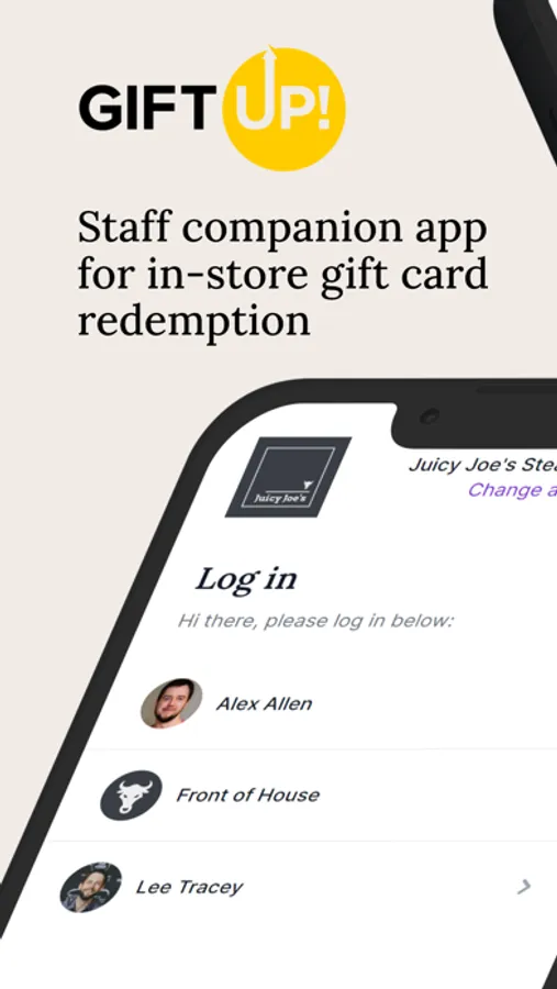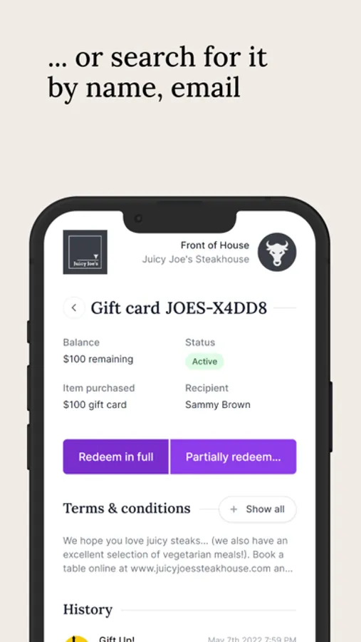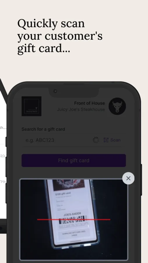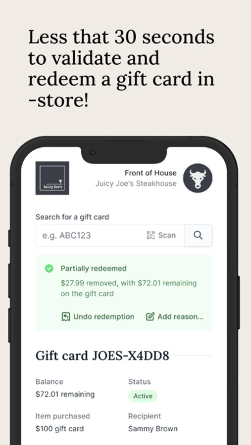 Staff companion app to quickly scan gift cards presented by a customer, either via email/print and Apple Pay wallet.