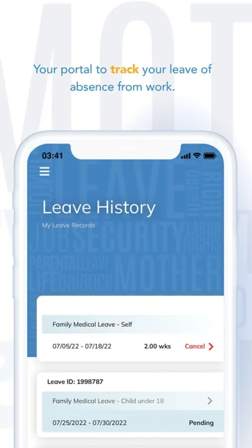 PLEASE NOTE: MYLEAVE MOBILE APP IS NOT FOR GENERAL USE. It is available only to employees for employers who have signed up for the LeaveSource service and only those employers that have opted to implement MyLeave. Use of MyLeave requires a one-time registration process. Information such as employee ID, work email address, date of birth and last 4 digits of SSN are used to verify your identity against the data provided by employers. This data is used once only during the registration process and is not stored on the mobile device.