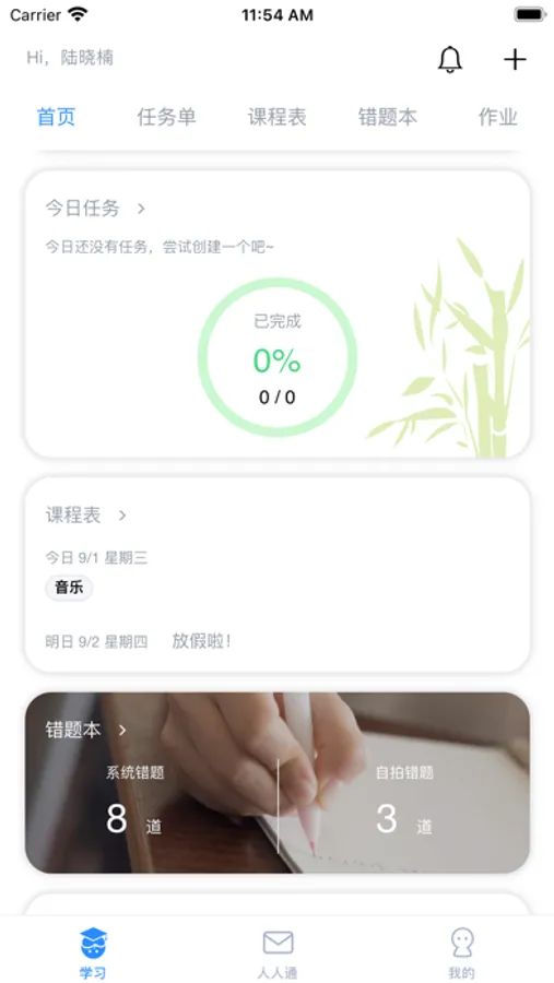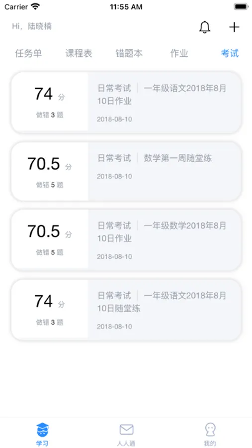 考一考学生端APP为学生提供了查看考试成绩、线上交作业、日常测验等学习环节,也为学生提供了错题本整理、分享打印、错题视频讲解、错题推荐试题等有效帮助提高学习成绩的学习内容。同时也为学生提供了课程表、任务单等学习辅助工具,帮助学生记录待办事项和准备课上书本。