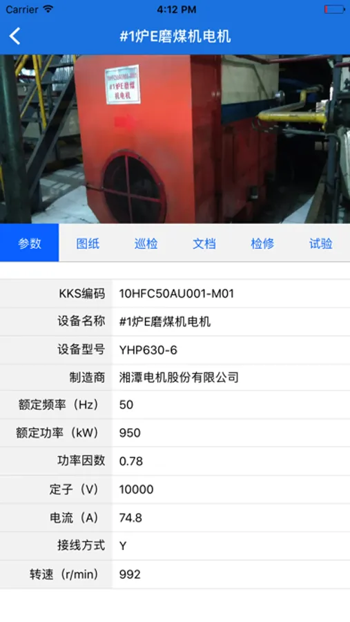 设备详情查看、基本参数、图纸、巡检记录、文件包、检修记录、试验报告