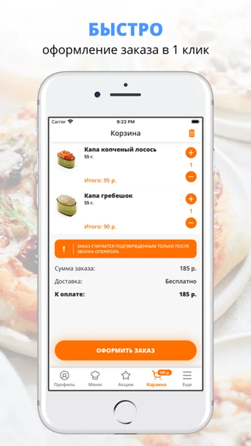Скачивайте наше приложение, оформляйте заказ и наслаждайтесь любимой едой, где бы Вы ни были! Приятного аппетита!