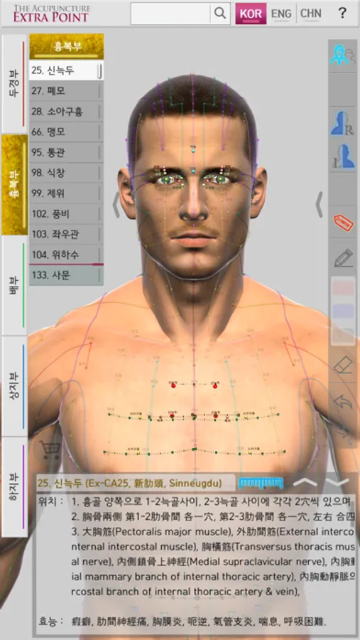 ‘The Acupuncture of Extra Point’ was created by integrating Extra Point from the past, and the newly discovered New Point together as one product. It allows for easy comparison because it expresses 14 Main Acupuncture Point Meridian and the Extra Acupuncture Point together in a male and female 3D model. Easily zoom in and out with multi-touch so you can see the exact location of The Acupuncture Point. It is recommended for people who want to see both 14 Main Acupuncture Point Meridian and the Extra Acupuncture Point at the same time. Contents include accurate location, based book, function and character (how to use). Released in Korean, Chinese and English, which allows it to be used across the world! With realistic skin, bone, and internal organs in 3D human body model, everything is distinguished by rich colors so it is very easy to see. It is based on The International Standard Acupuncture Points of WHO, WHO`s International Standard Terminologies on Traditional Medicine in The Western Pacific Region, The acupuncture textbooks of the university of Asian Medicine and 'Huangdi Neijing - Lingshu’. It is supervised by professors and Korean medical doctors from Korea Medical University. * 14 Main Acupuncture Point Meridian - 12 Main Acupuncture Point, Governor Vessel (GV) Acupuncture Point, Conception Vessel(CV) Acupuncture Point.- See The Meridian 2.0