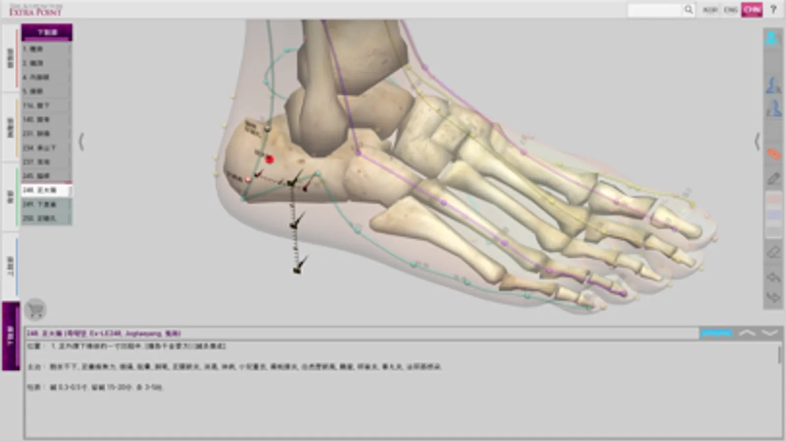 In 'The Acupuncture of Extra Point’, the skin, bones, and internal organs of the 3D human model look realistic. The 14 Main Acupuncture Point Meridians and the Extra Acupuncture Point are distinguished by rich colors so they are very easy to see.