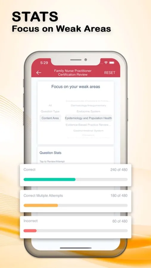 * Stats (View details on topics mastered so you can focus on weak areas)