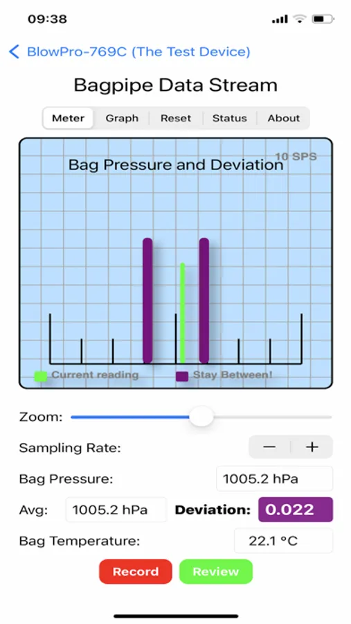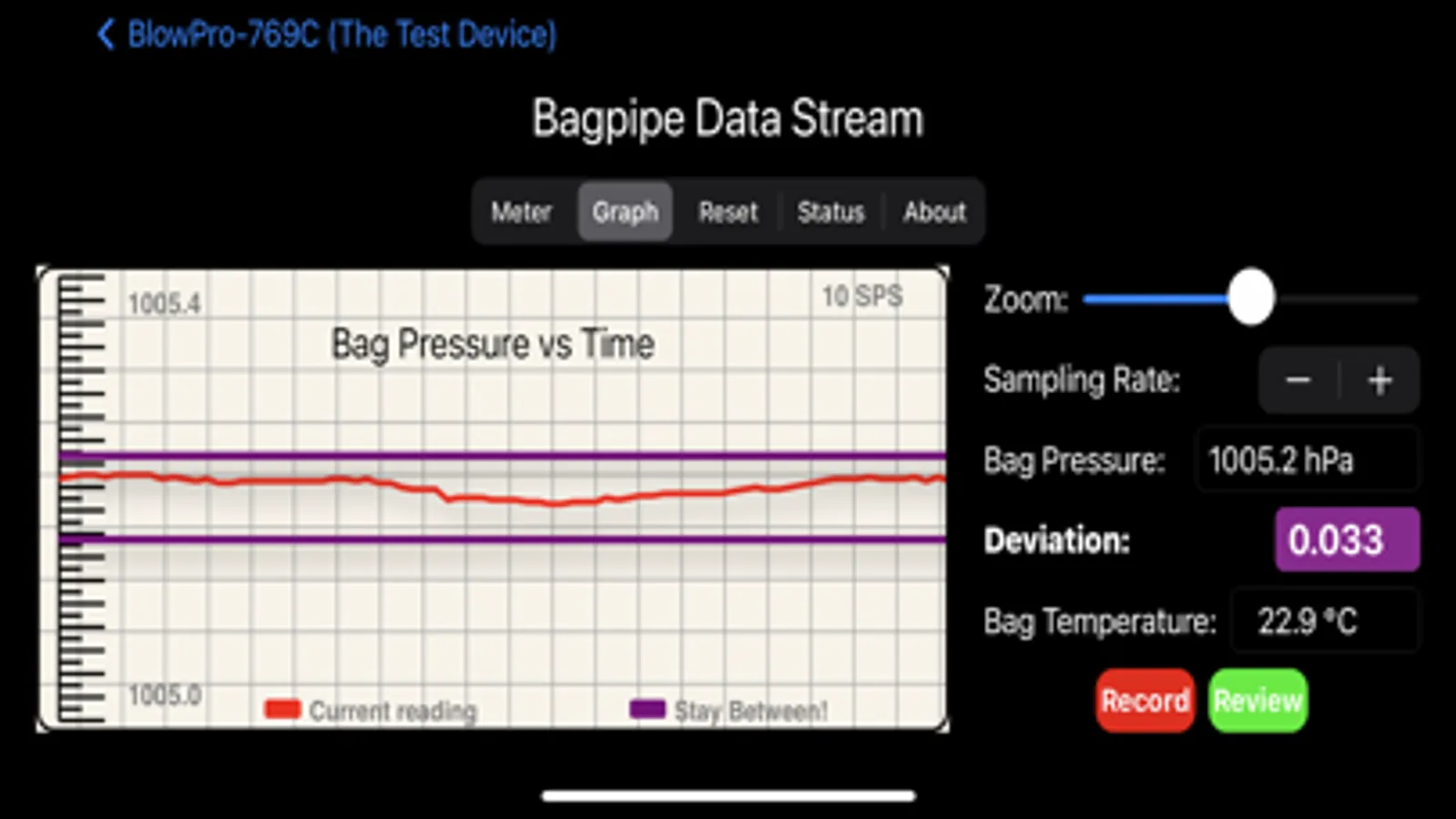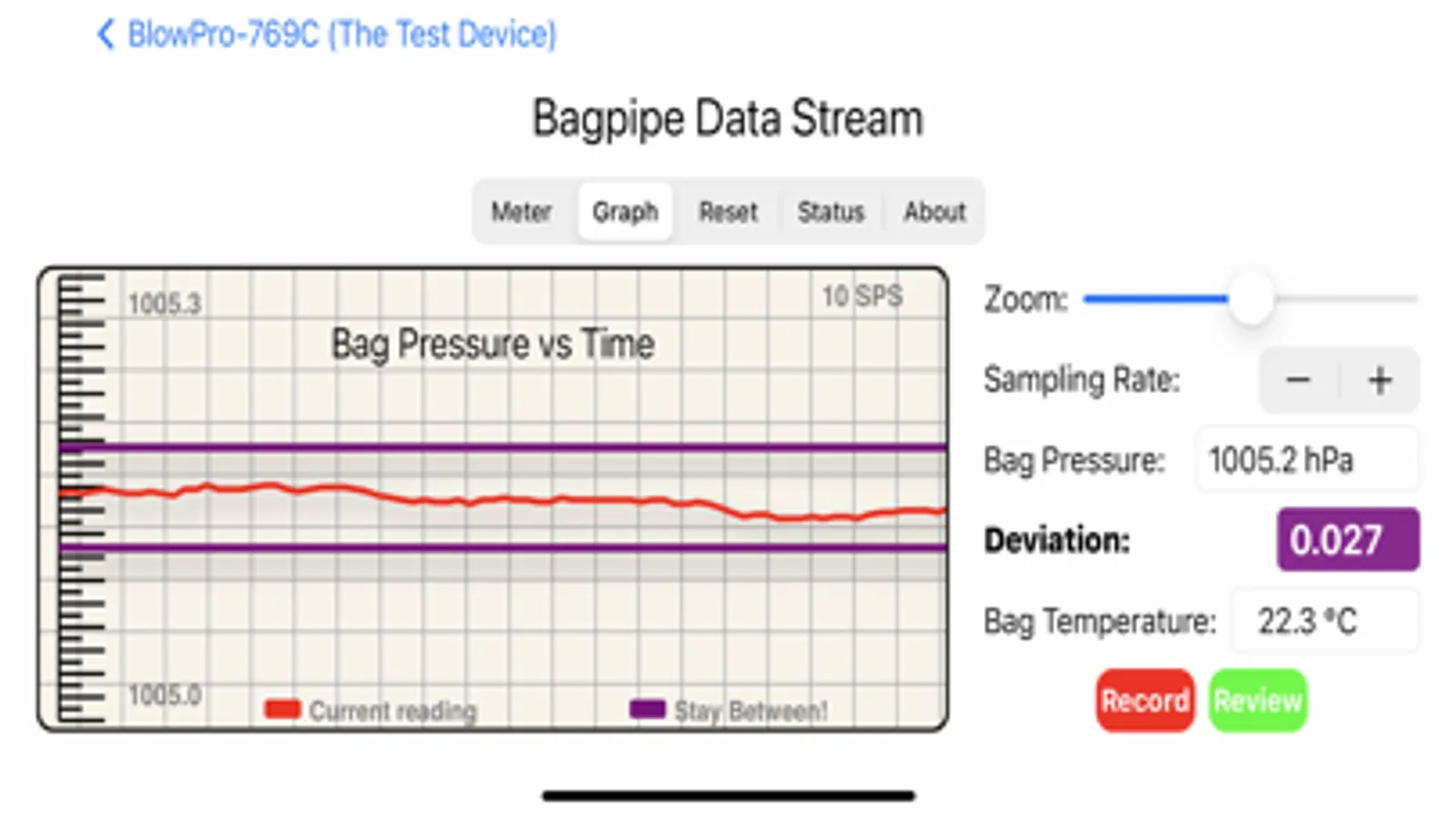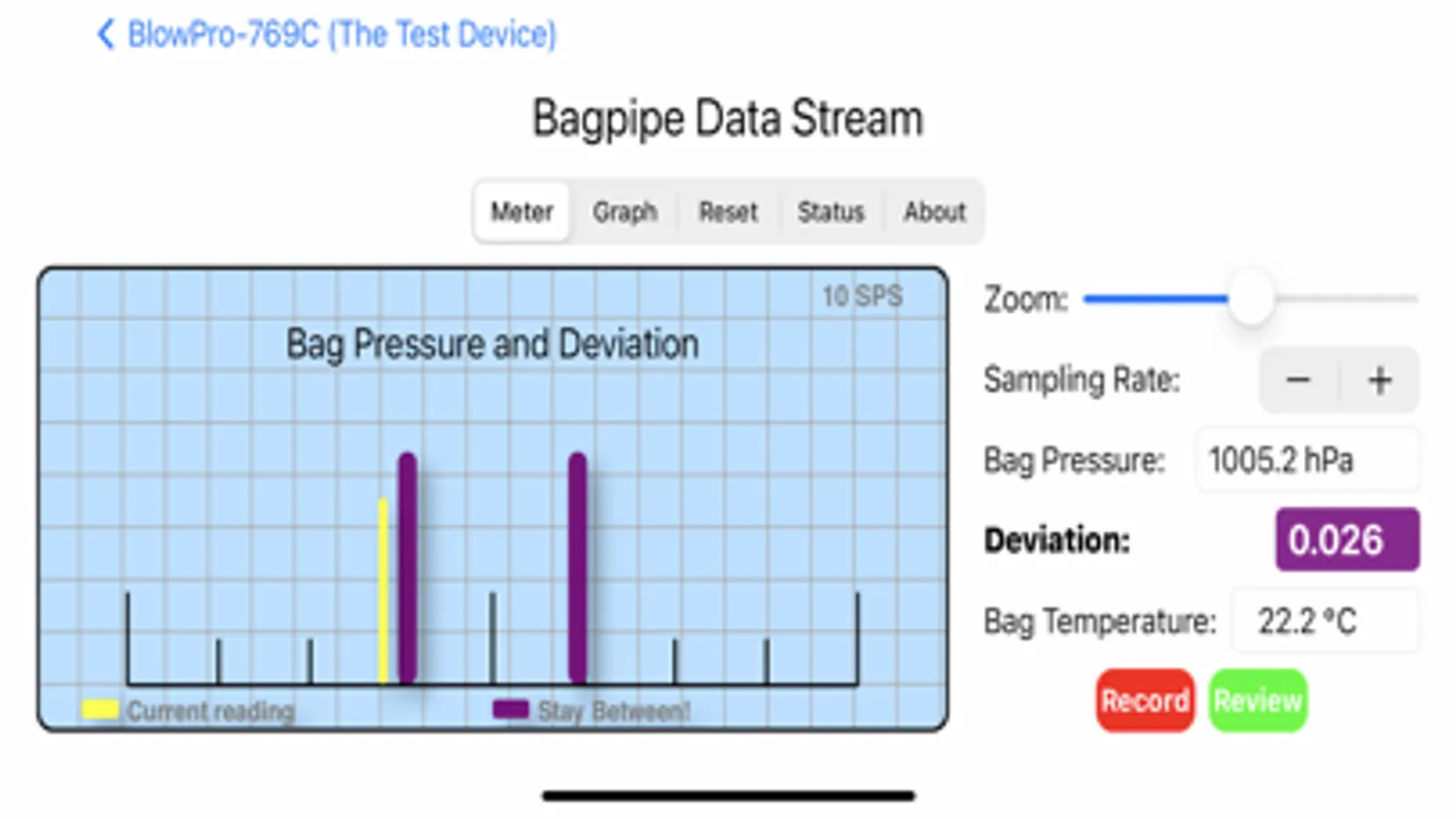 Place the BlowPro sensor in your pipe bag and use this app to display bag pressure graphically. This real-time visual feedback helps you improve your blowing, an advanced piping skill.