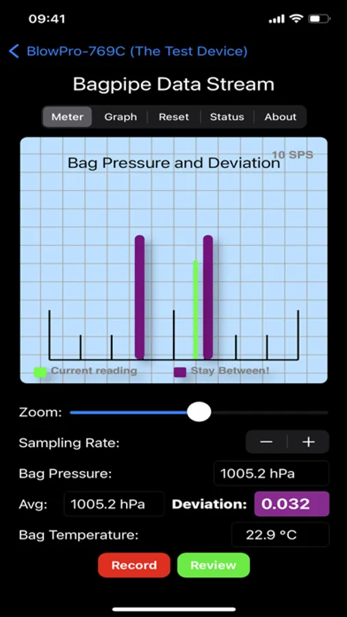 The BlowPro app is used in conjunction with the BlowPro Bagpipe Pressure Sensor to monitor pipe bag pressure and temperature in real-time.