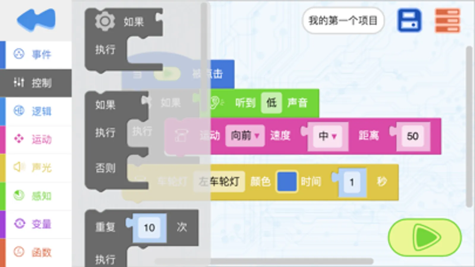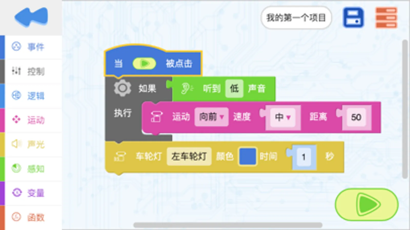 1.在编程模式,小朋友可以用app中的图形化代码块自由的编写程序来控制机器人移动,在不同的部位亮不同的灯光,在脸部刷不同的表情,播放不同的音乐等。