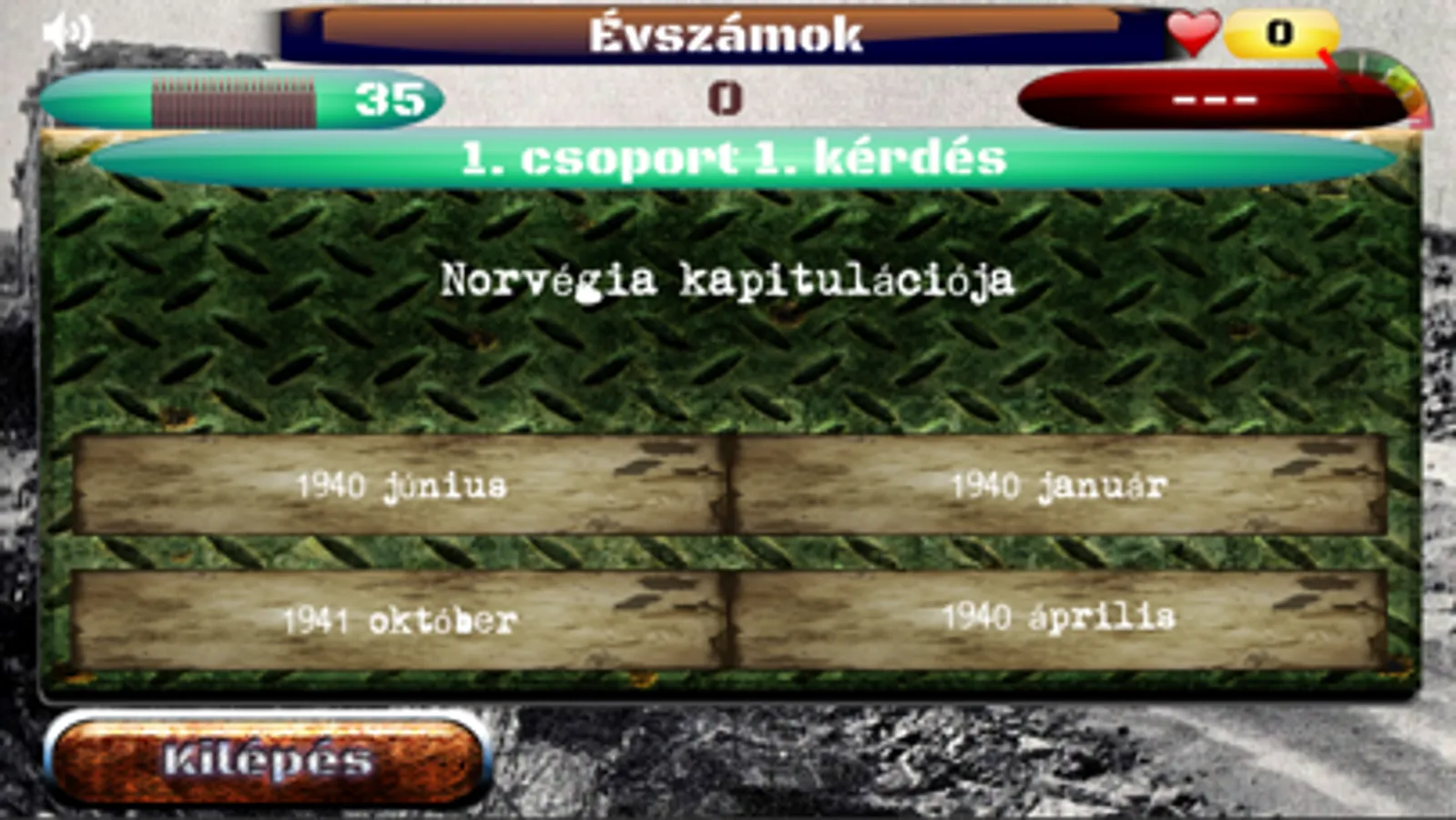 A kérdések négy témakörre vannak bontva. Ezek az évszámok, események, személyek és egy képekkel illusztrált fegyverek kategória.