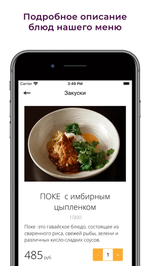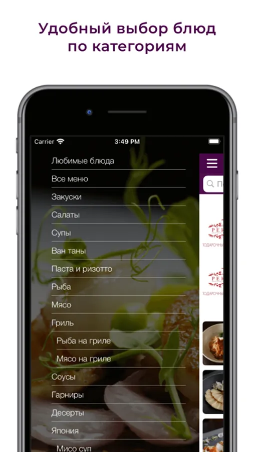 В нашем мобильном приложении Вы сможете заказать доставку самых изысканных и оригинальных блюд: стейки из лучших сортов мраморного мяса и наисвежайших морепродуктов, классические роллы, суши и гунканы, а также фирменные роллы от шеф-повара. Наши кондитеры ежедневно создают десерты ручной работы, которые станут украшением даже самых роскошных торжеств.