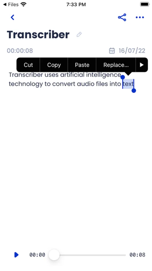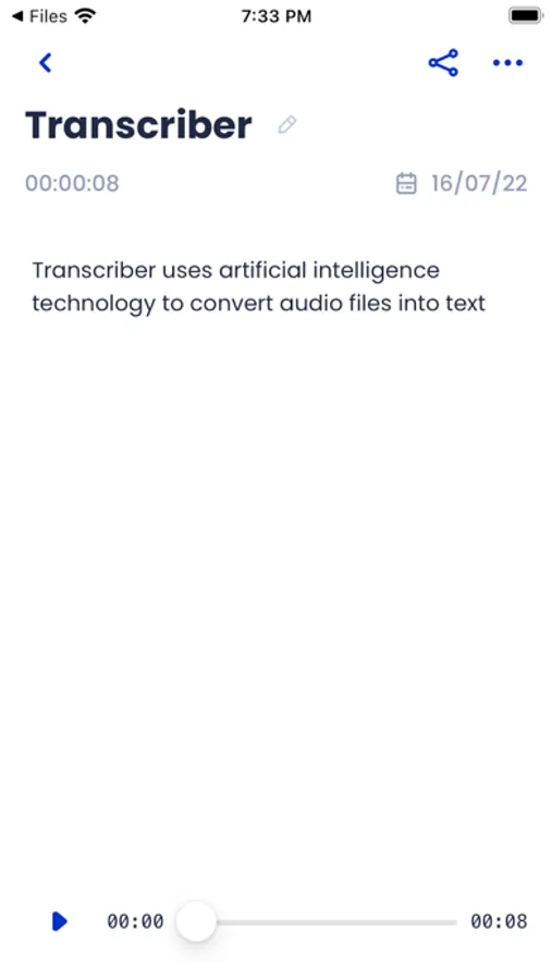 Transcriber uses artificial intelligence (AI) technology to convert audio files into text. You can have an interview with by recording an interview with your iPhone, iPad, or Apple Watch, or import an audio file from a third-party app. Here are the main features built-in: