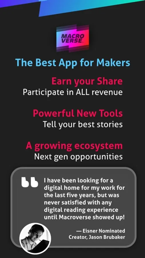 Enjoy a wide range of free episodes and exclusive series and subscribe for unlimited access to EVERYTHING for one low price. Better yet, Macroverse is built with and for the creators that make the stories you love. All subscription revenue is shared directly with the creators who make the comics on our app. Subscribing to Macroverse directly supports the next generation of comics creators and helps them make more great work for you to enjoy. See how great that is!