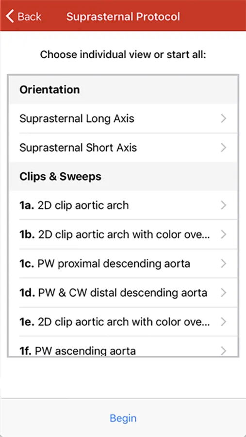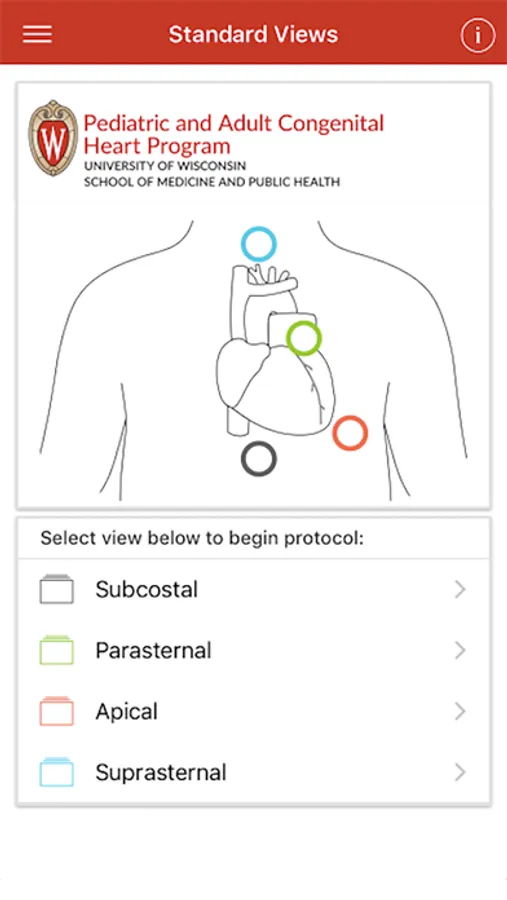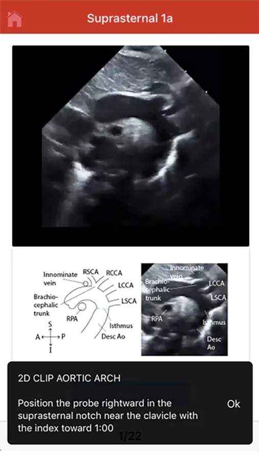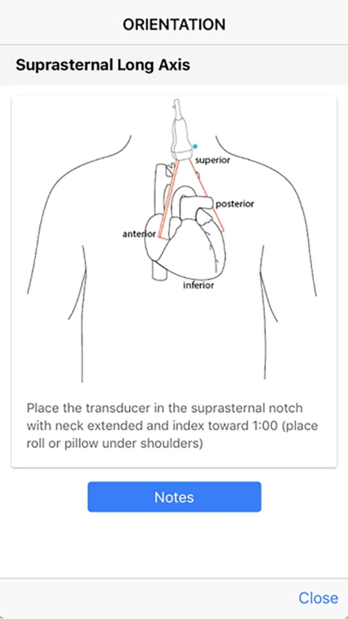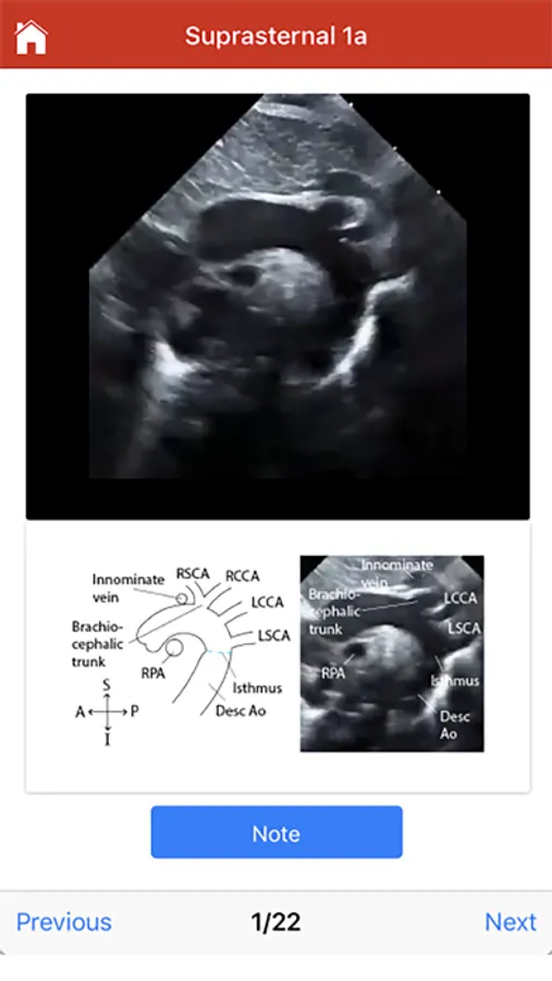 The exact images and the order in which the images and views are obtained varies by institution. Each protocol (subcostal, parasternal, apical or suprasternal) can be followed in order by clicking on the next tab at the bottom of the page or you can click on an individual numbered view within the protocol list to be taken directly to that view. The name of the view and instructions will pop-up automatically at the bottom of the page. The instructions and additional notes can also be found in the “NOTE” button at the bottom of the page.