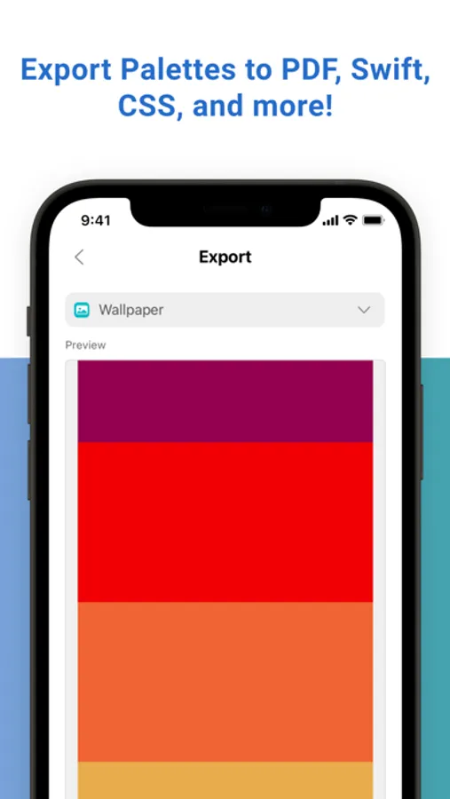 • Export colors to different languages and files: PDF, iPhone wallpaper, ASE, CSS, Sass, Swift, CLR, HTML, JSON, and more!