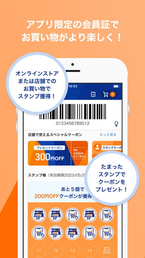・店舗、オンラインストアでのお買物で、購入金額に応じてスタンプが貯まり、貯まったスタンプはクーポンに交換。