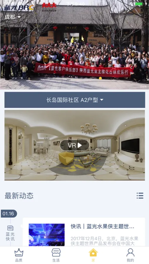 -新增“家”的功能,打开定位可直接获取所在楼盘地址,查看楼盘最新 进度,让业主在线了解最新楼盘动态,小区周边情况。
