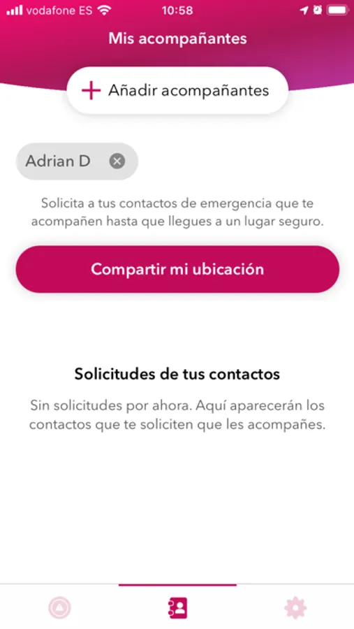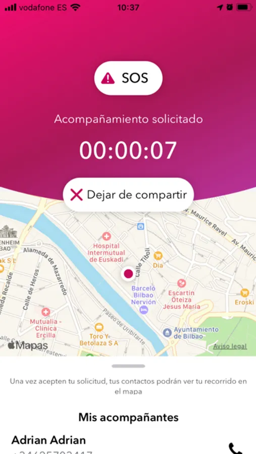 Botón Acompáñame que te permitirá activar el modo acompañamiento con cualquier persona de tu lista de contactos hasta que llegues a tu destino.