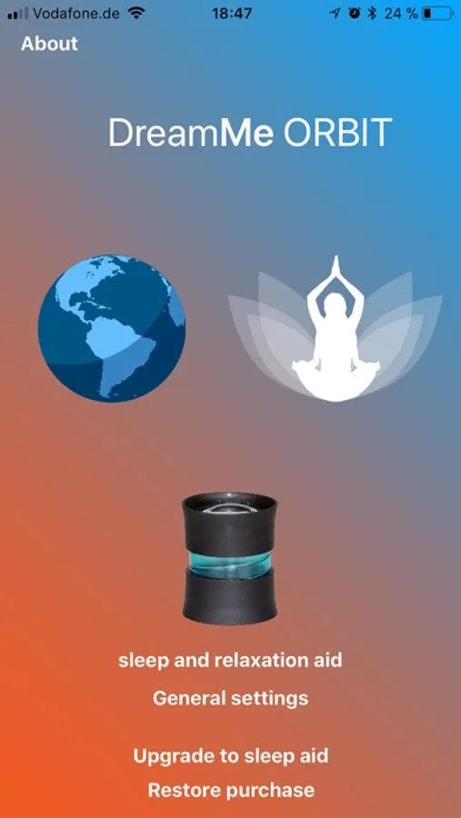 Sleep aid (inapp): DreamMe ORBIT supports you and helps you intuitively bring your breathing into the right relaxing balance. With DreamMe ORBIT you can turn off your mind - effectively and quickly so you can relax and sleep.