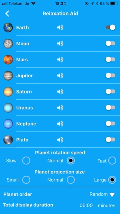 Relaxation aid: Become the "astronaut" who moves around the selected planet in the "orbit". DreamMe ORBIT turns your smartphone into a pocket planetarium. The calming rotation of the planets and the relaxing sounds have been proven to reduce the pulse beat and bring your thoughts into distant galaxies. Thus, DreamMe ORBIT prepares you for the sleep phase and helps you to relax. Optionally, custom relaxation or sleep sounds can be selected. You can customize the DreamMe ORBIT APP to your personal liking. In addition to the visual relaxation by DreamMe ORBIT, the selected planet sequence is supported by selected soundtracks matching the respective planet. Each of the eight planets and the moon, are assigned their own sound, all of them are unique and relaxing. In the app, the background sounds can be activated or deactivated. The length / duration as well as the volume are also set here. If you want, you can also play your own music.