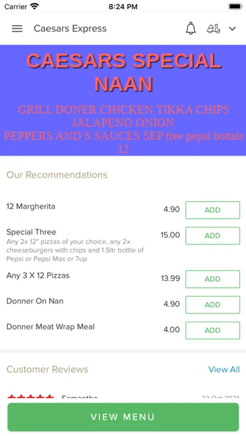 Order food online in Bradford! It's so easy to use, fast and convenient. Try our new, online website which contains our entire takeaway menu. The Caesars Express is located in Bradfords.You can now order online, all your favourite dishes and many more delicious options, and have them delivered straight to your door in no time at all.