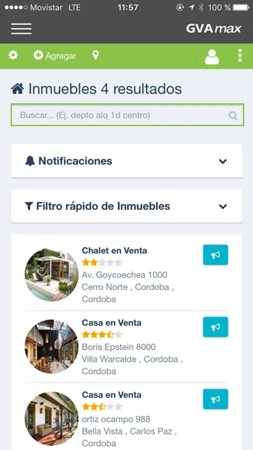 La APP de GVAmax permite trabajar sobre sus inmuebles, clientes y gestionar grupos de trabajo. Gracias a su sistema de notificaciones podrá enterarse en tiempo real del movimiento de su inmobiliaria, recibir alertas cuando por ej. algún cliente realice una consulta o se actualice la ficha de un inmueble, entre otras muchas opciones.