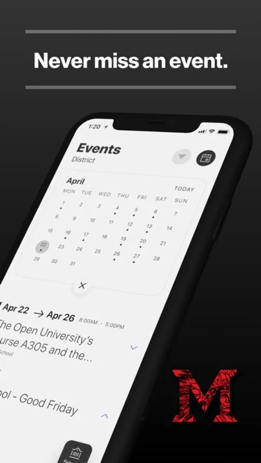 The event section shows a list of events throughout the district. Users can add an event to your calendar to share the event with friends and family with one tap.