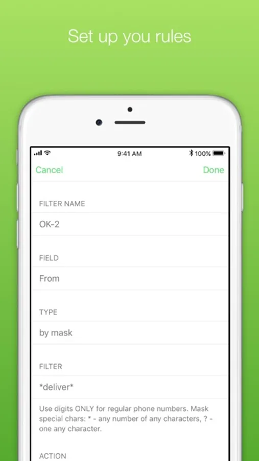• Easy and convenient way to build your own personal filtering list: just add any number and choose an action;
